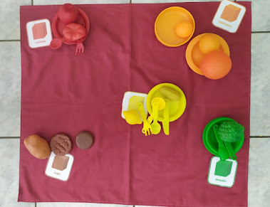Ζητήσαμε από τα παιδιά να μαζέψουν φύλλα σε αυτά τα χρώματα από μια βόλτα με τους γονείς τους και να μας τα φέρουν στο σχολείο. Με αυτό τον τρόπο τα παιδιά εμπλέκονται ενεργά στη διαδικασία της μάθησης και δείχνουν μεγαλύτερο ενδιαφέρον για το θέμα, όπως και έγινε. Τα φύλλα τα παρατηρήσαμε ως προς το χρώμα, το μέγεθος και το σχήμα, κάνοντας ταξινομήσεις και ομαδοποιήσεις. Με αυτό τον τρόπο, δουλέψαμε εκτός απο τα χρώματα και τις προμαθηματικές έννοιες "ίδιο - διαφορετικό", "μεγάλο - μικρό", "μεγαλύτερο από - μικρότερο απο".